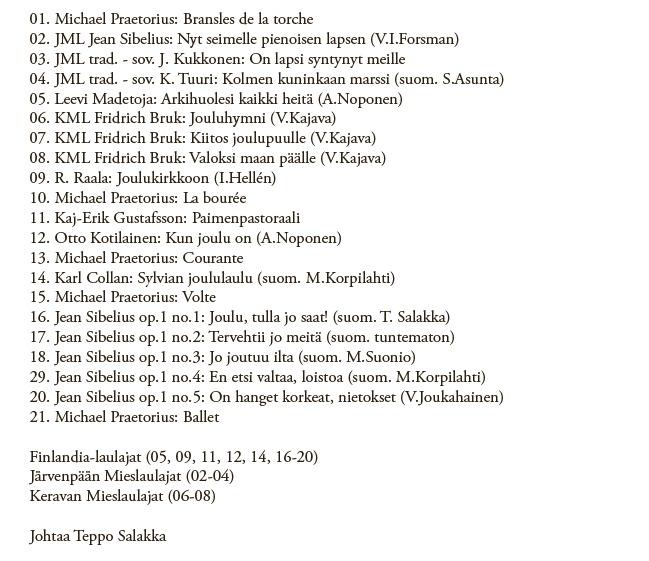 Jouluksi 2025 ilmestynyt levy sisältää useita ennen levyttämättömiä lauluja ja sovituksia, mm. Jean Sibeliuksen Opus 1, ensimmäistä kertaa mieskuoron kokonaan suomeksi esittämänä, sekä kolme Fridrich Brukin kaunista joululaulua, niinikään ensimmäistä kertaa mieskuoron levyttämänä.